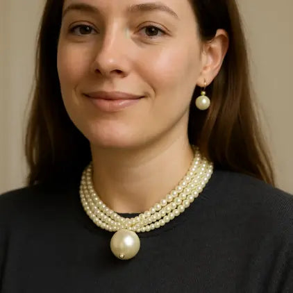 Make an unforgettable impression with our Glamorous Multi-Layer Pearl Necklace, a stunning accessory designed to exude sophistication and elegance. This captivating piece features five meticulously crafted strands of lustrous simulated pearls, creating a luxurious, full-bodied look that gracefully drapes around your neckline. The grand finale is a single, prominent large, round simulated pearl pendant, adding a touch of dramatic flair and timeless beauty.