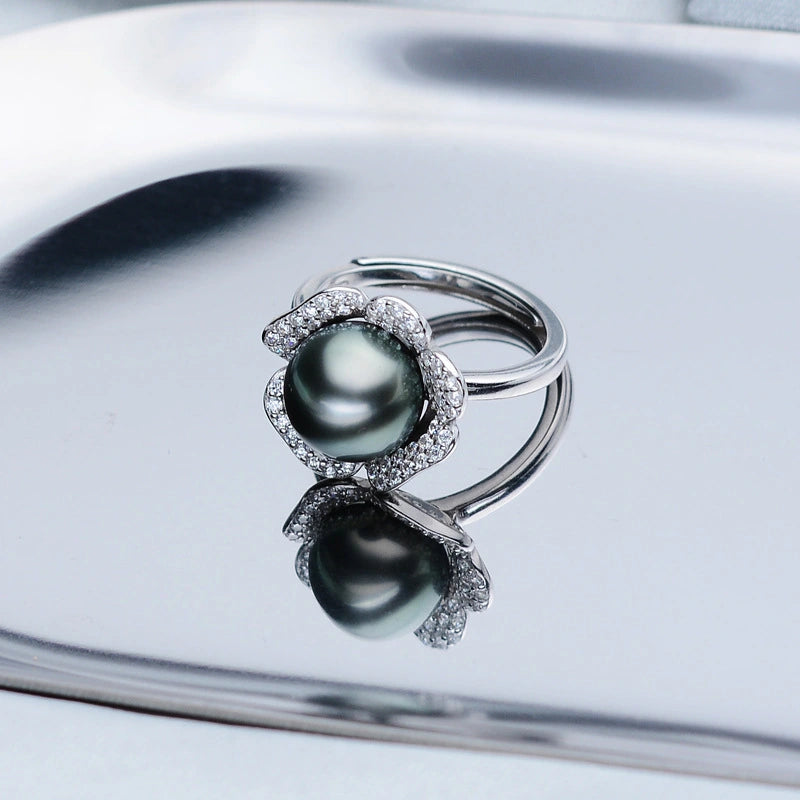 The intricate floral motif is adorned with sparkling brilliant stones, creating a brilliant halo that beautifully complements the pearl's dark glow.