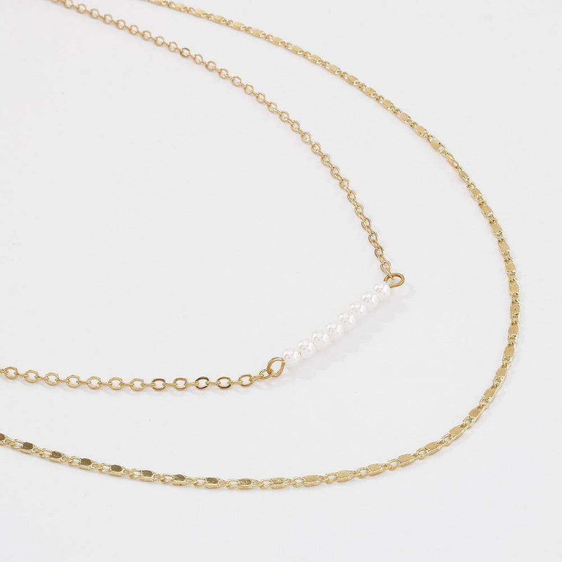 Each layer boasts a unique chain style – including a sleek flat link, a delicate beaded chain adorned with small simulated pearls, and a classic cable chain – adding depth and visual interest.